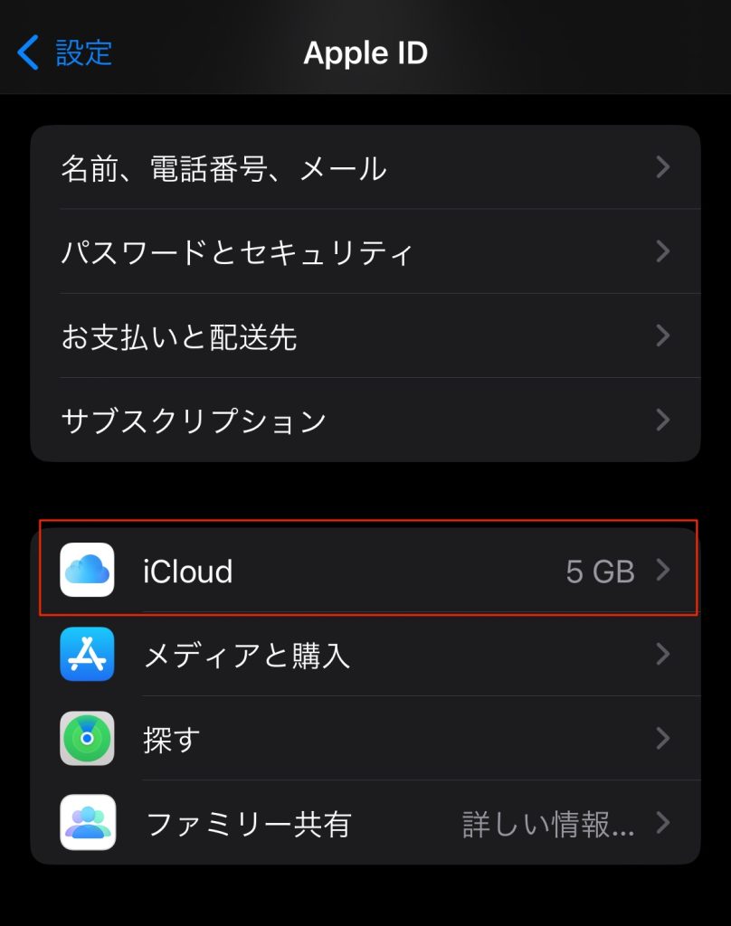 2.Apple ID画面から「iCloud」をタップします。
