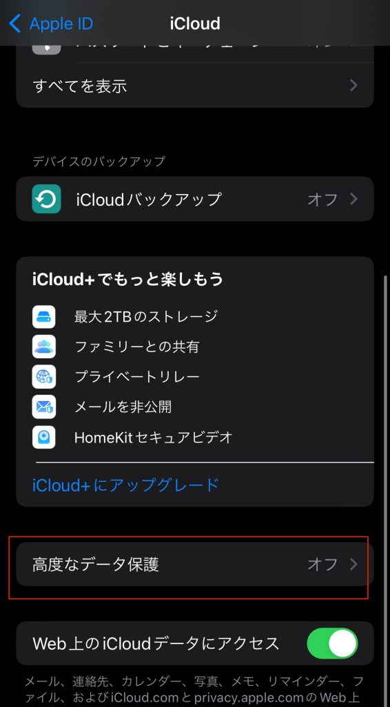 3.iCloud画面にある「高度なデータ保護」をタップします。