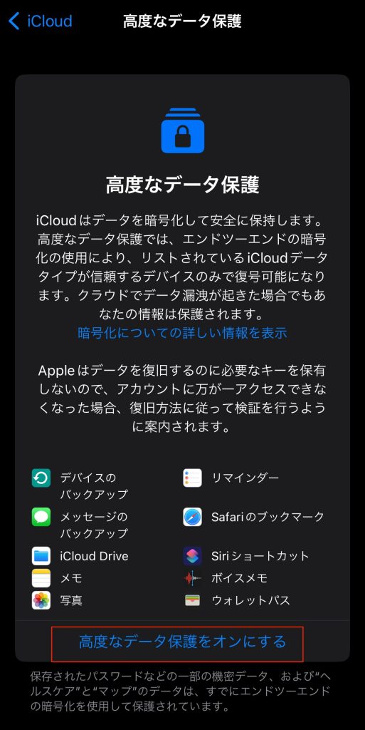 4.「高度なデータ保護」の画面が表示されるので、「高度なデータ保護をオンする」をタップします。