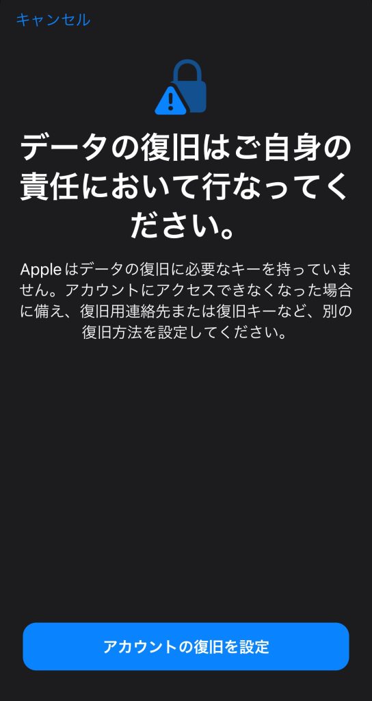 5.Appleはセキュリティによりデータの復旧に必要なキーを持っていないため、アカウント復旧用連絡や復旧キーの登録、全てのデバイスを最新のOSへアップデートすることでデータは保護されるようになります。