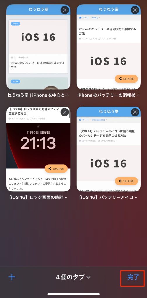 普通だとタブを閉じる時にはバツボタンをタップして閉じますが、右下の「完了」ボタンを長押しします。